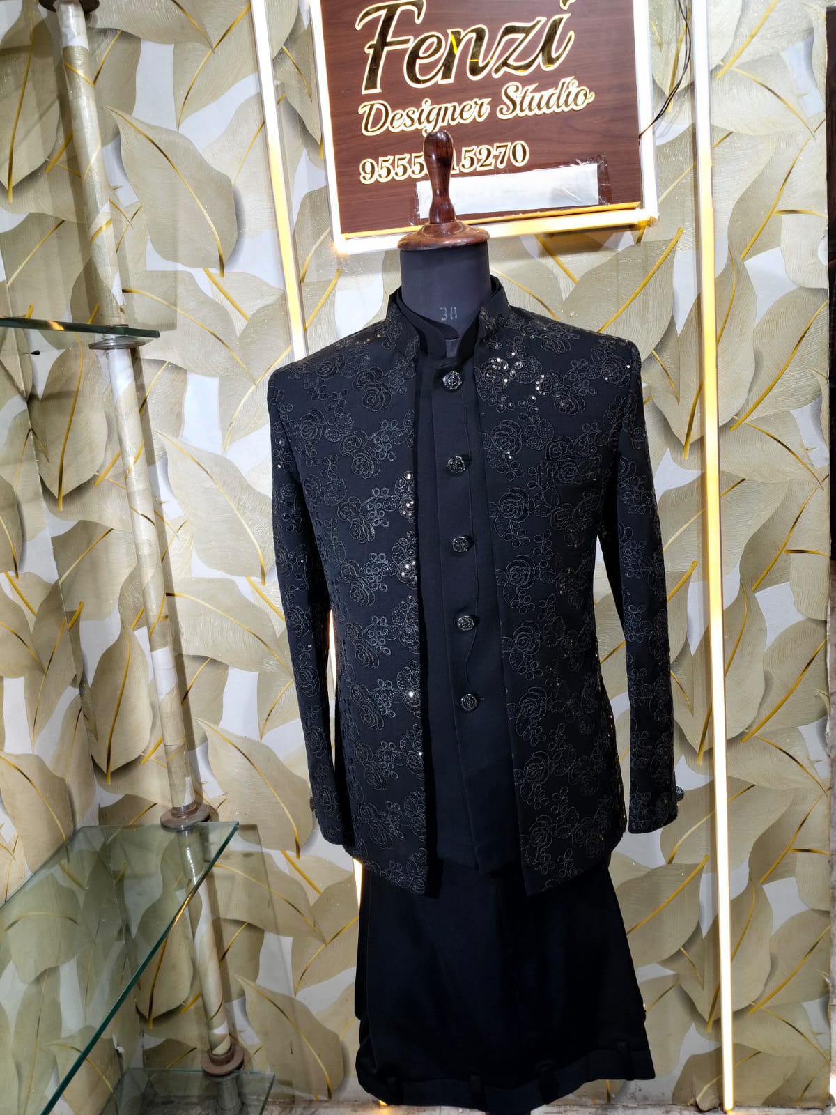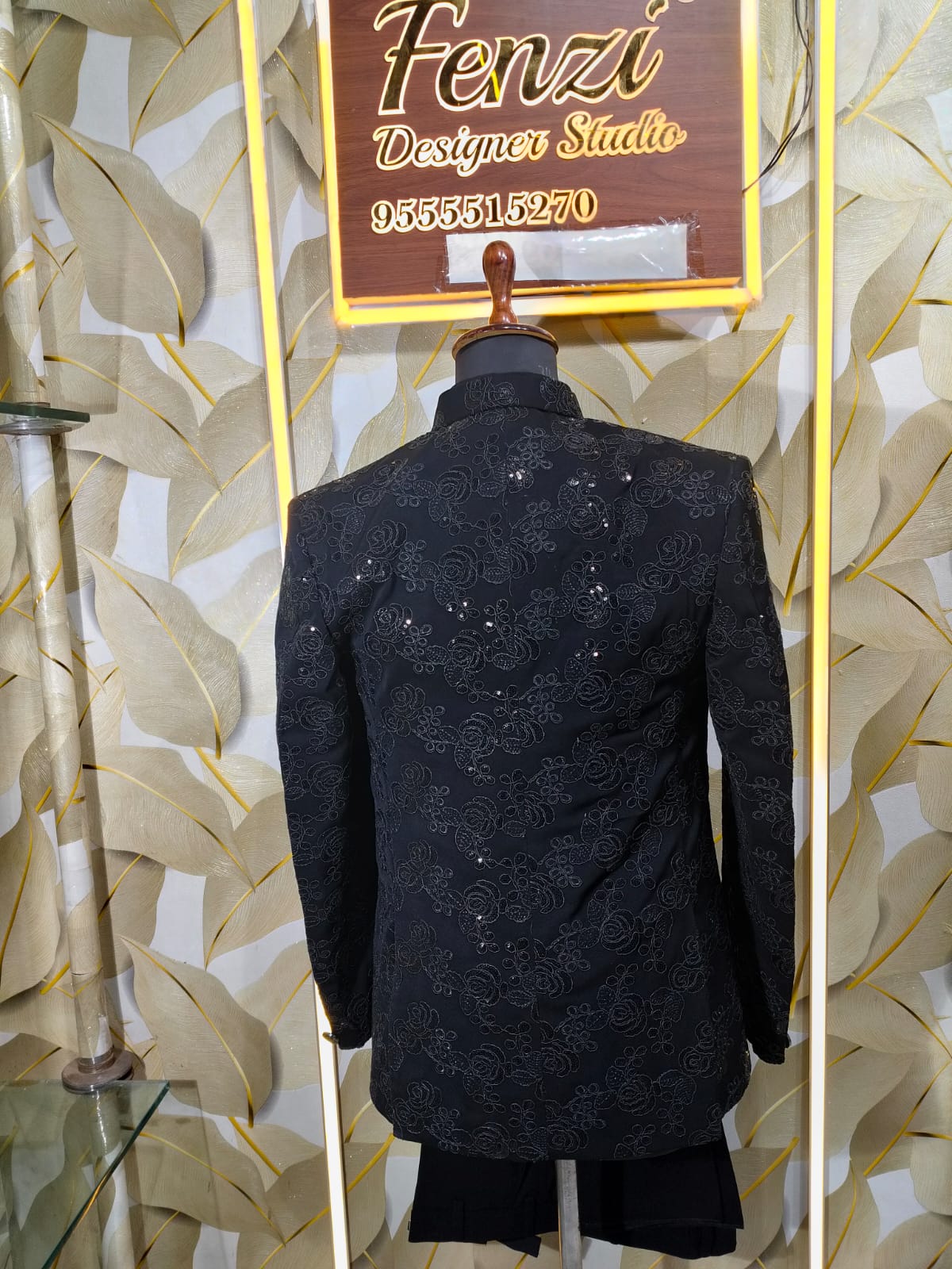 A premium black Jodhpuri suit featuring rich floral embroidery, elegant buttons, and a contemporary design — ideal for special occasions.