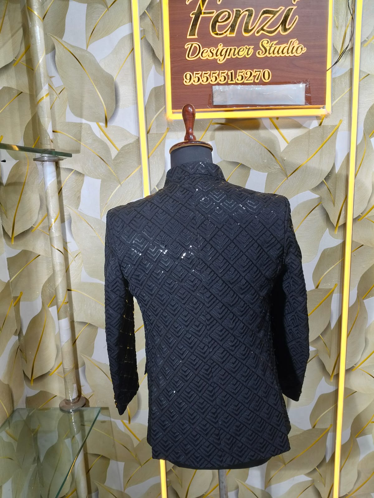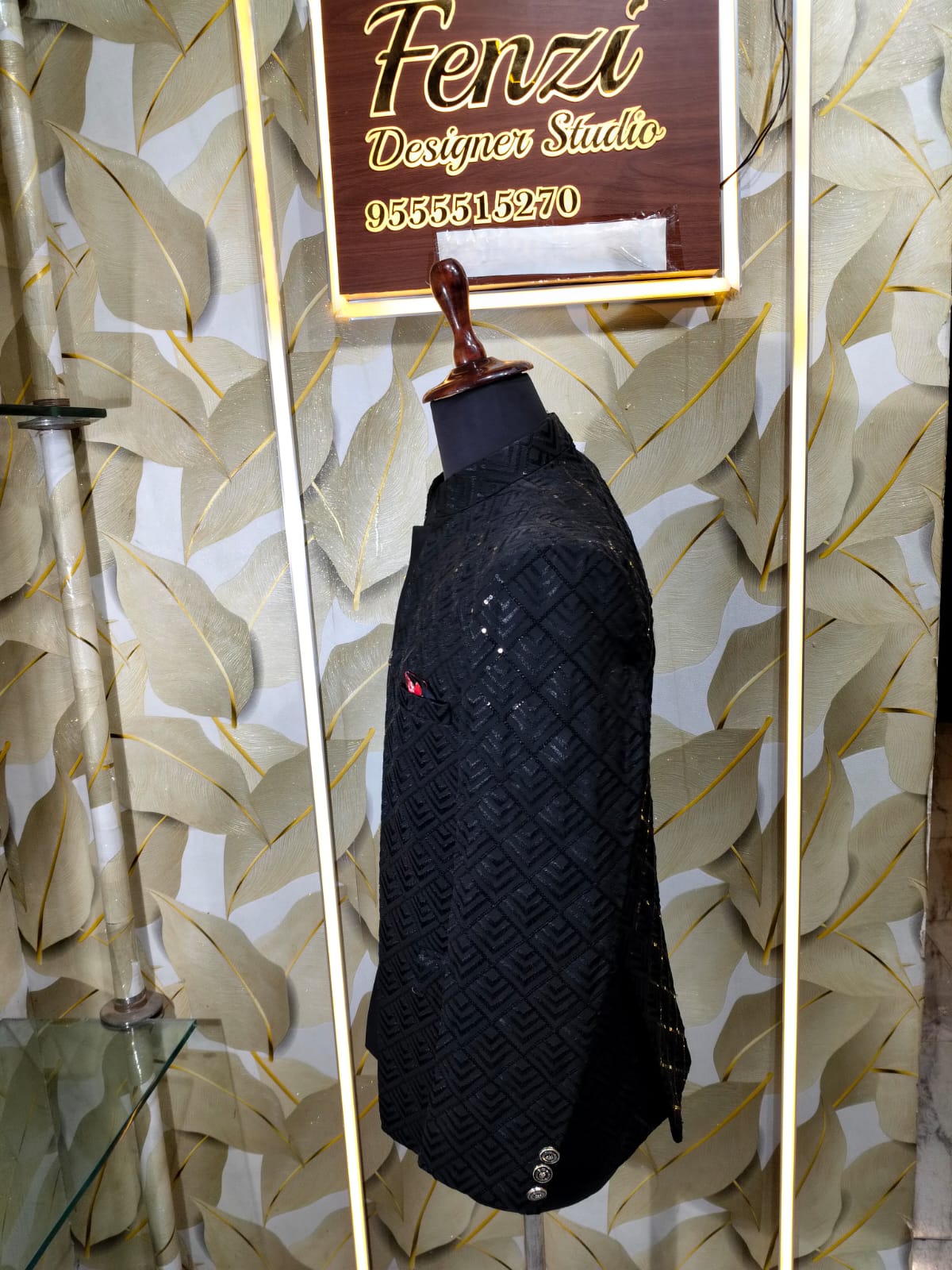 A luxurious black sherwani with a rich geometric texture, metallic buttons, and a sleek modern silhouette—perfect for weddings, receptions, and festive events.