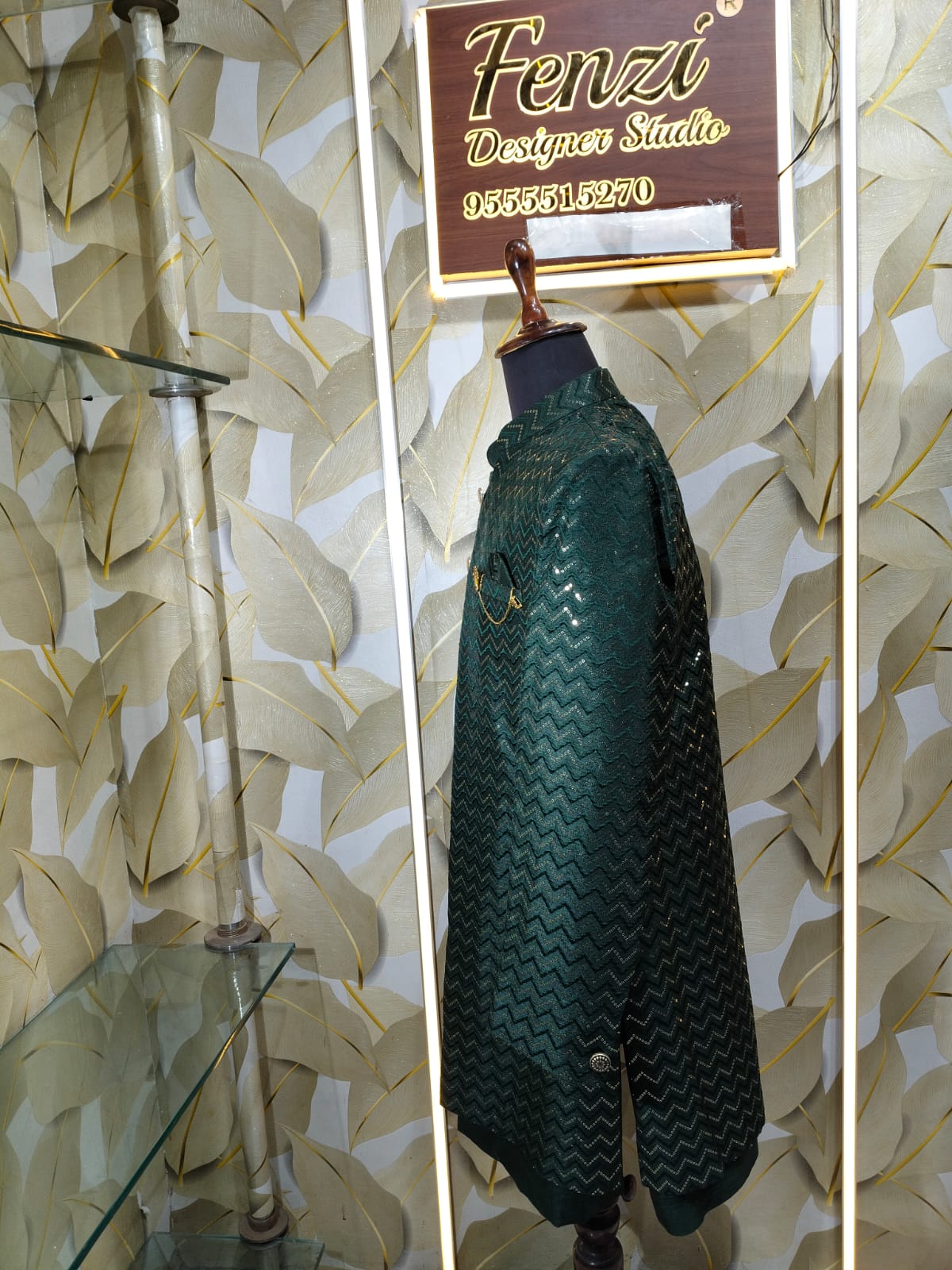 The Dark Green Textured Designer Indo Western redefines elegance with its intricate zigzag-patterned fabric and luxurious detailing. Crafted to perfection, this sherwani features a regal mandarin collar, ornate metallic buttons, and a sophisticated chest brooch chain. The deep green hue exudes class and confidence, making it a perfect choice for grooms or anyone attending grand celebrations. Designed by Fenzi Designer Studio, it represents a seamless fusion of traditional Indian craftsmanship and modern fashion sensibilities.