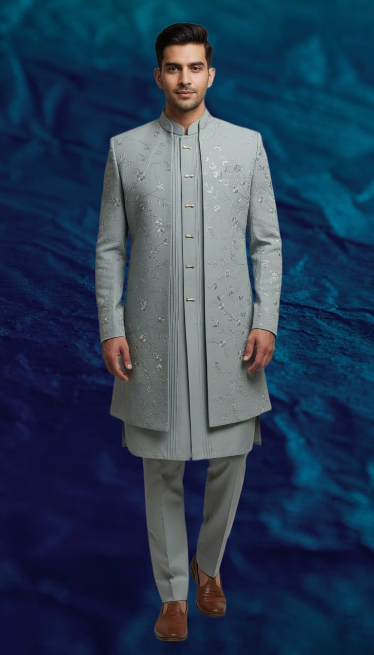 Elegant Dove Grey Embroidered Indo-Western Achkan Set