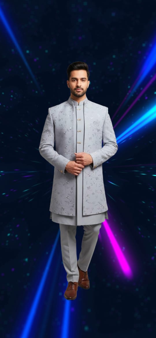 Step into sophistication with this elegant grey Indo-Western sherwani set. Crafted from luxurious jacquard silk, the sherwani jacket features intricate tone-on-tone embroidery with subtle thread and sequin work, adding a touch of sparkle and texture. The tailored, slim-fit silhouette offers a modern look while the classic mandarin collar maintains a traditional feel. This layered ensemble includes a matching inner kurta and comfortable pants, making it a complete outfit for any grand occasion. Perfect for weddings, engagements, and festive celebrations, this sherwani set is a timeless addition to any wardrobe.