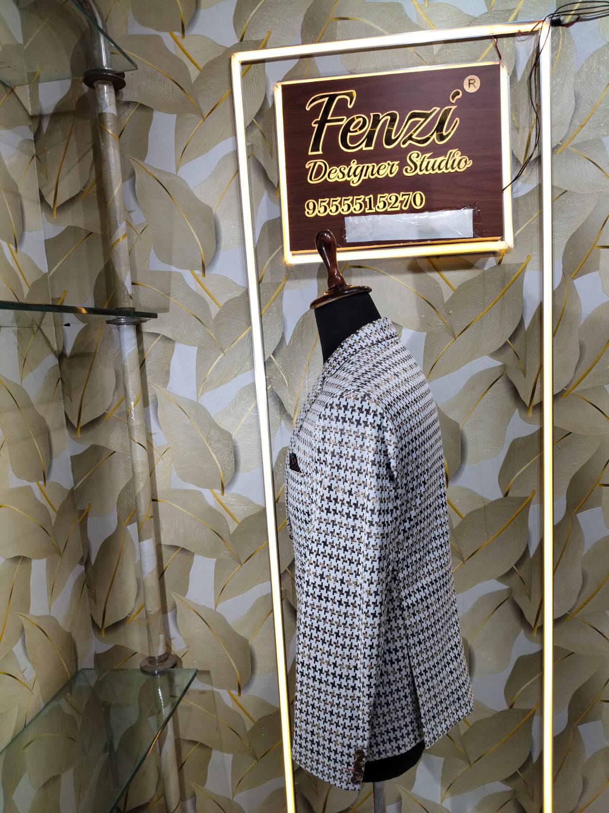 Elevate your wardrobe with the Fenzi Classic Houndstooth Designer Blazer, an exclusive creation from Fenzi Designer Studio. Featuring a distinctive houndstooth pattern in neutral tones, this blazer combines traditional charm with a contemporary silhouette. Designed with precision tailoring, double-button closure, and a stylish pocket square, it’s perfect for formal occasions, business events, and evening gatherings. Experience comfort, class, and confidence in one refined ensemble — meticulously made to make you stand out effortlessly.
