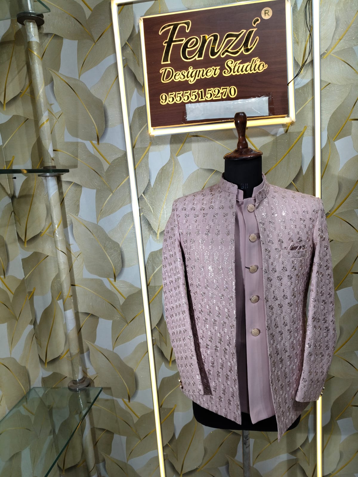 This Men’s Light Pink Embroidered Jodhpuri set Jacket from Fenzi Designer Studio combines traditional craftsmanship with contemporary elegance. The jacket features intricate thread and metallic embroidery, premium buttons, and a refined mandarin collar that enhances the overall royal appeal. Perfect for grooms, groomsmen, and festive wear, this outfit adds charm, style, and sophistication to any special occasion. With its luxurious detailing and modern fit, it’s a standout piece for celebrations and ethnic events.