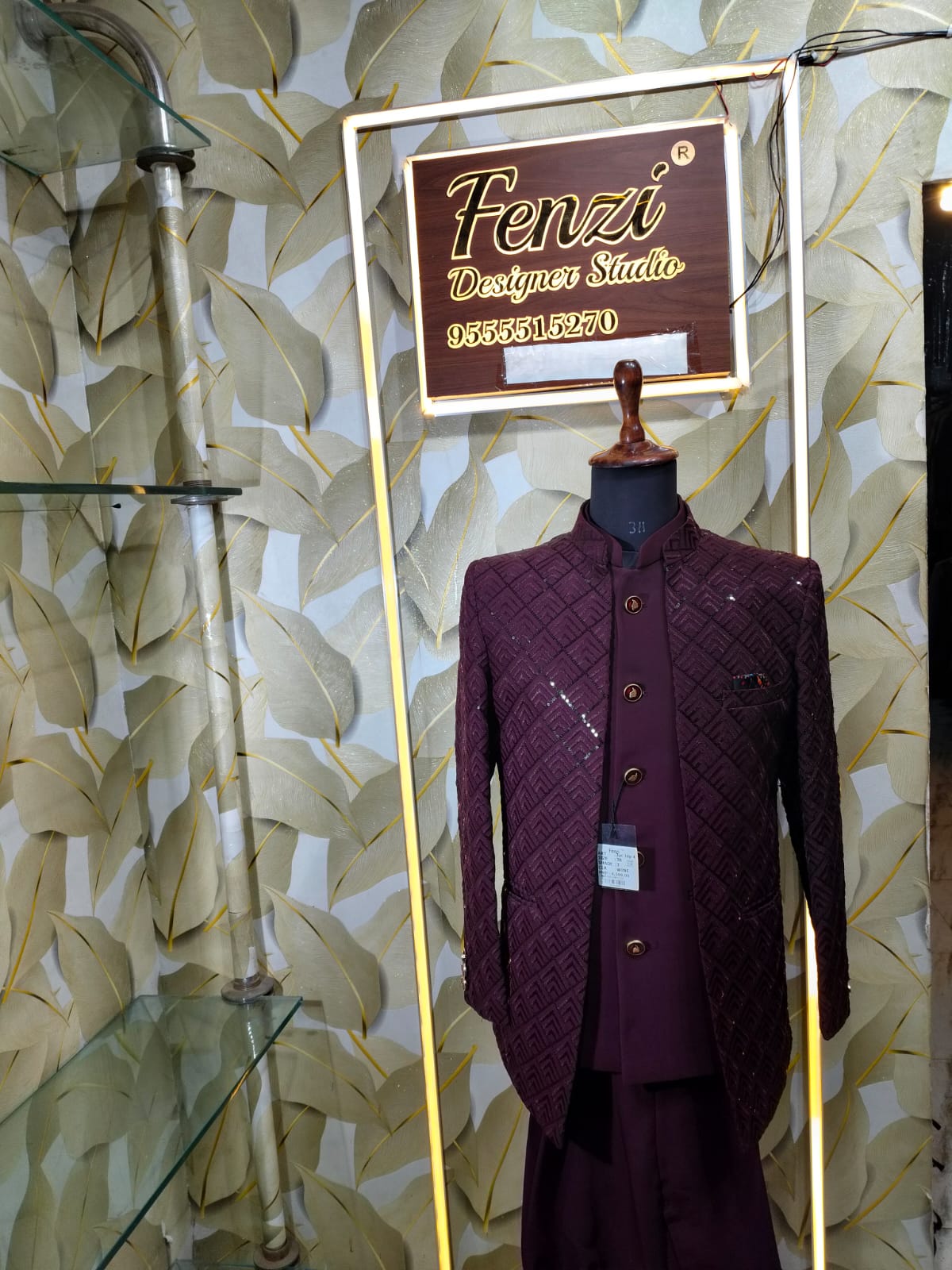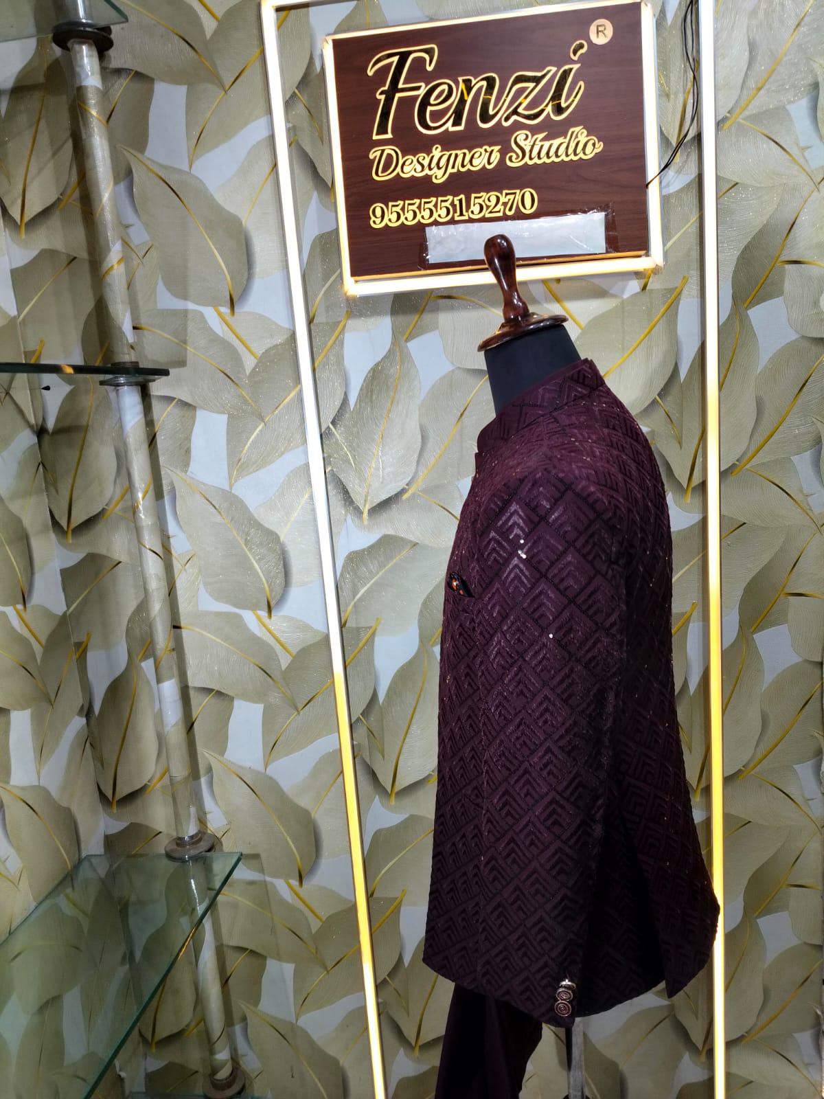 Experience timeless elegance with this premium Maroon Embroidered Jodhpuri from Fenzi Designer Studio. Designed with a finely detailed geometric embroidered pattern, this sherwani reflects sophistication and modern ethnic style. The rich fabric, paired with gold-tone buttons and a sleek, structured fit, makes it an ideal choice for weddings, engagements, receptions, and festive events.