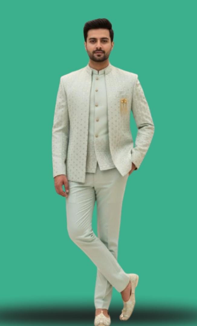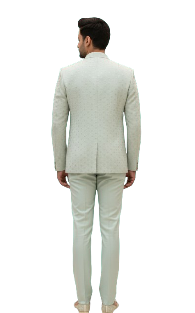 Step into timeless sophistication with our Mint Regal Textured Jodhpuri Suit Set, crafted for the modern gentleman who appreciates royal elegance. This ensemble features a refined mint green color palette complemented by a textured Jodhpuri coat and matching waistcoat, beautifully enhanced with classic buttons and a statement brooch. Paired with tailored trousers, the silhouette is sleek, sharp, and perfectly balanced.