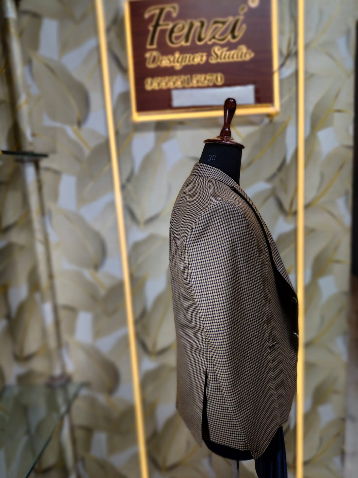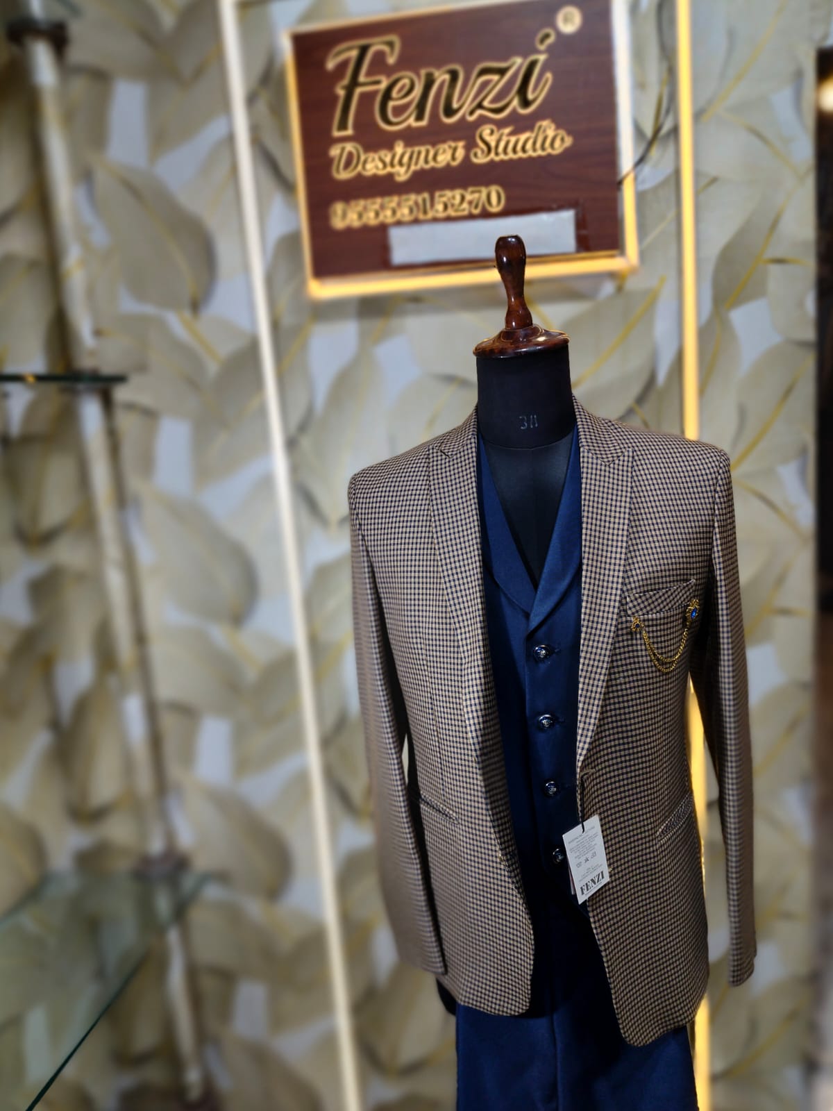 Elevate your formal style with this premium 3-piece suit from Fenzi Designer Studio. The ensemble features a sophisticated brown micro-check blazer, paired with a deep navy waistcoat and coordinated trousers for a polished, modern look. Designed with a tailored fit, elegant lapels, and a gold chain accessory, this suit blends classic craftsmanship with contemporary charm.
