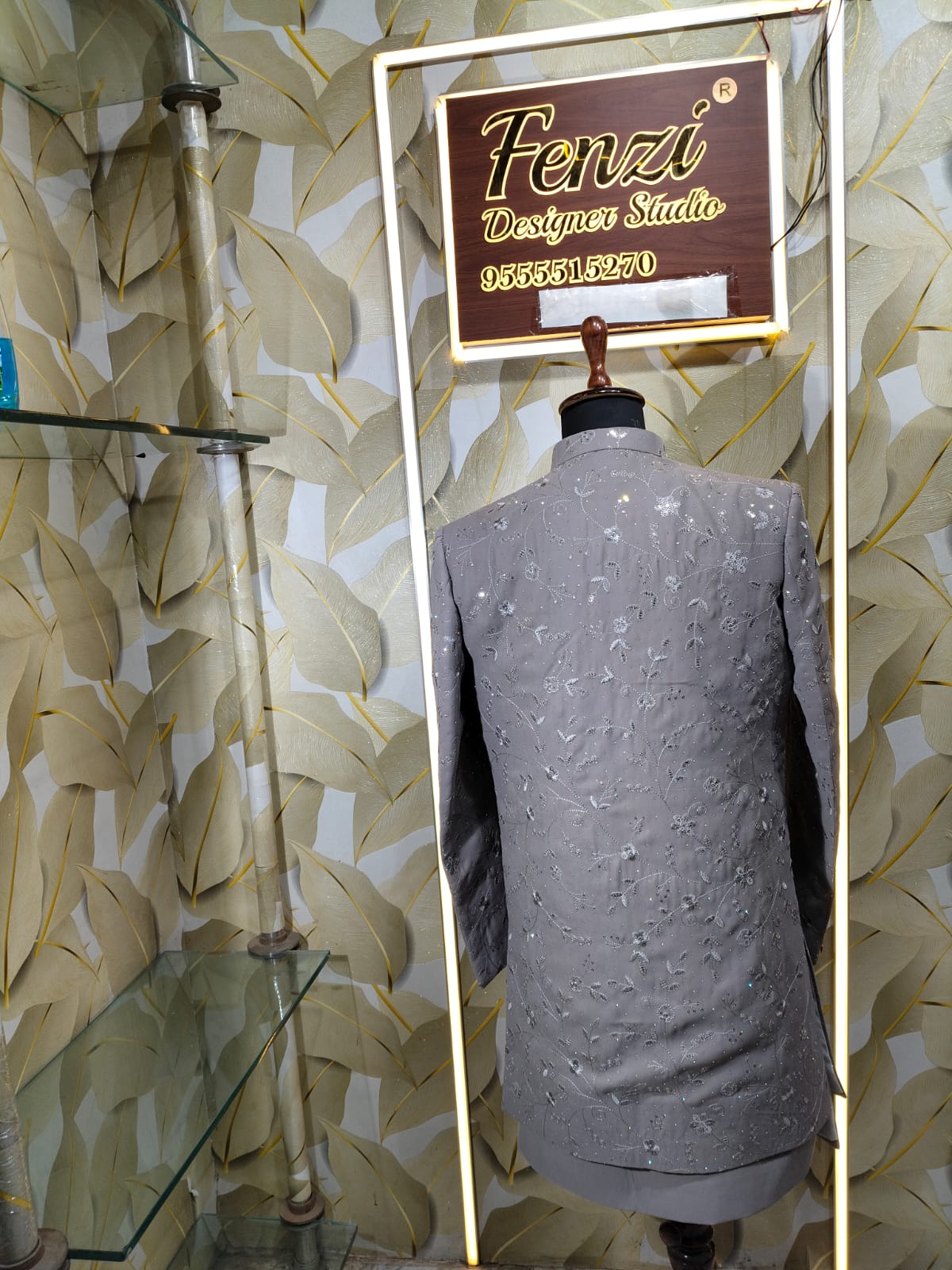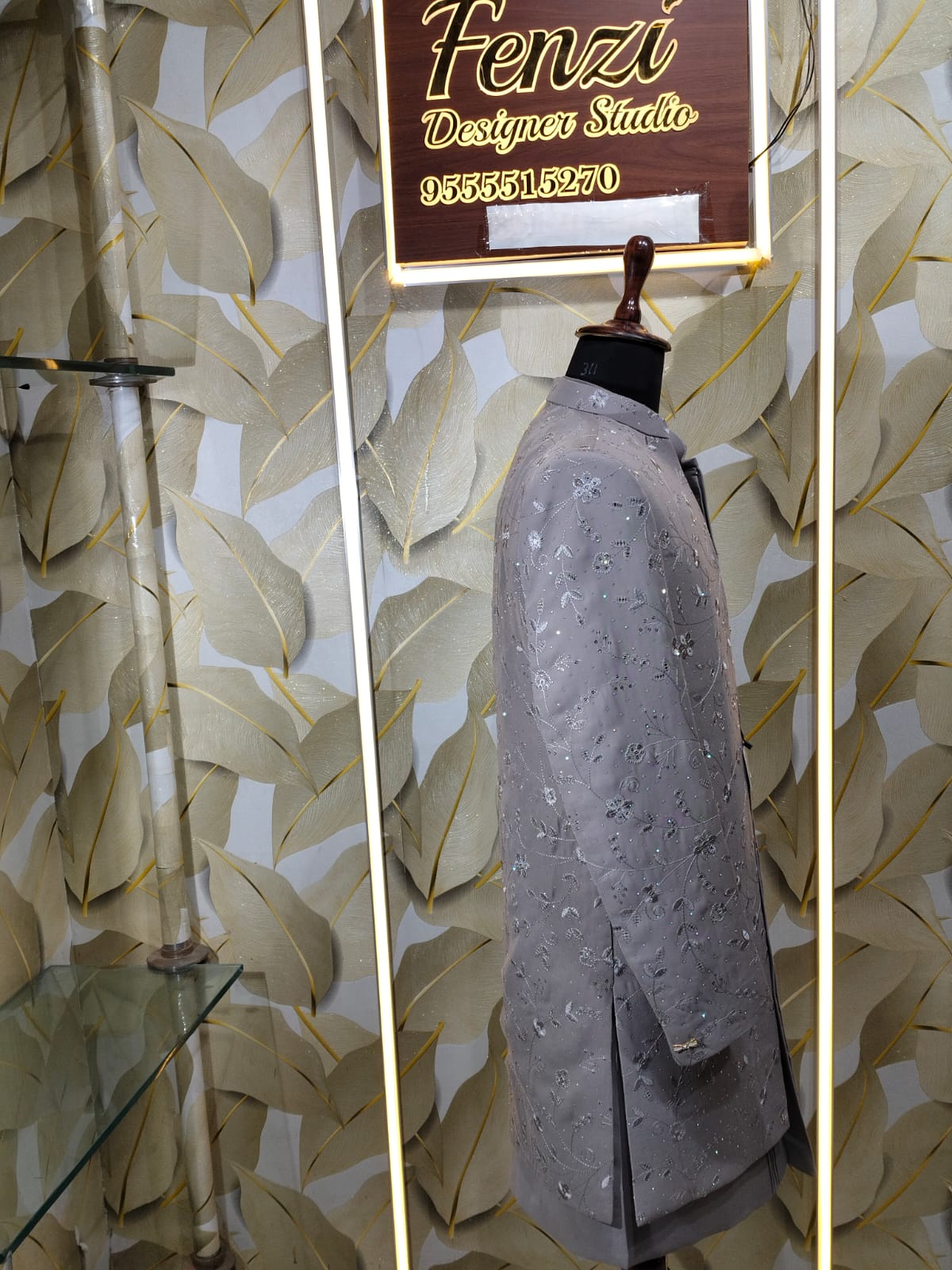 Elevate your ethnic wardrobe with this Regal Grey Embroidered Indo Western from Fenzi Designer Studio. Crafted with precision and adorned with delicate threadwork, this sherwani exudes timeless elegance and royal appeal. The refined grey hue complements its subtle embellishments, making it perfect for grooms, festive occasions, or high-end cultural events. Tailored to perfection, it ensures both comfort and class, helping you stand out in every celebration.