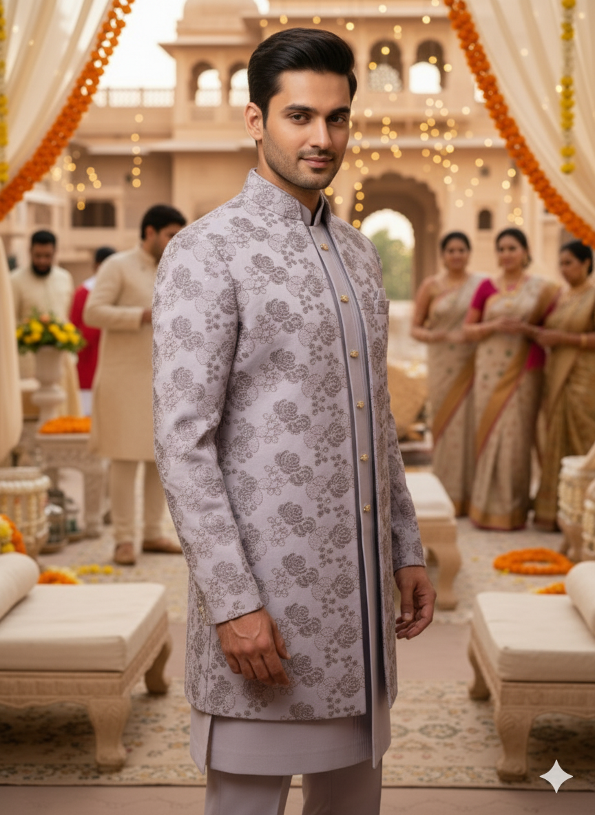 This sherwani features an elegant lavender base adorned with intricate floral embroidery, creating a refined and sophisticated look. Designed with a mandarin collar and detailed metallic buttons, it offers a perfect balance of traditional charm and modern elegance. Ideal for weddings and festive occasions, this ensemble ensures a graceful and polished appearance with a luxurious finish. Perfect for grooms and groomsmen aiming for a timeless statement.