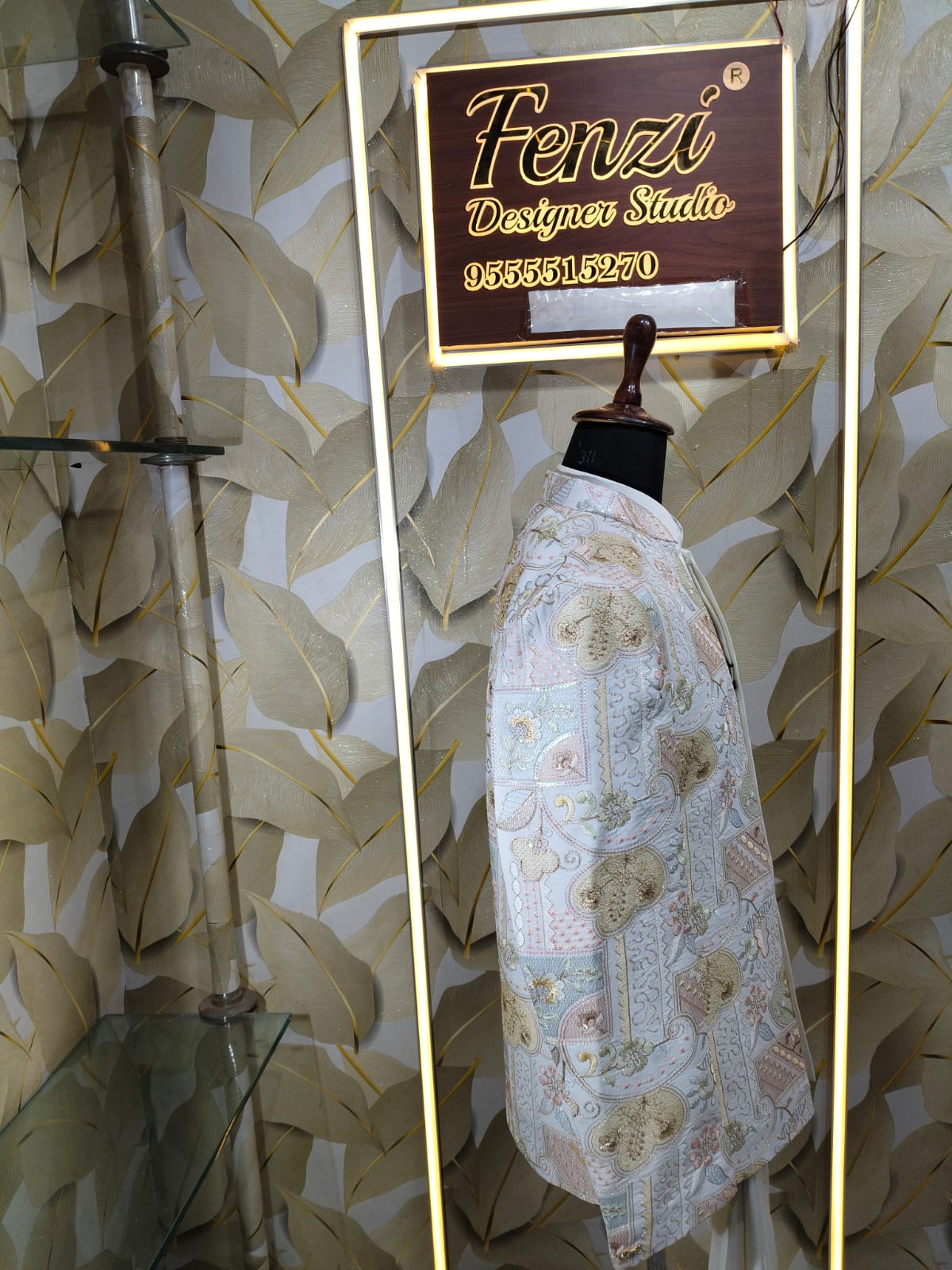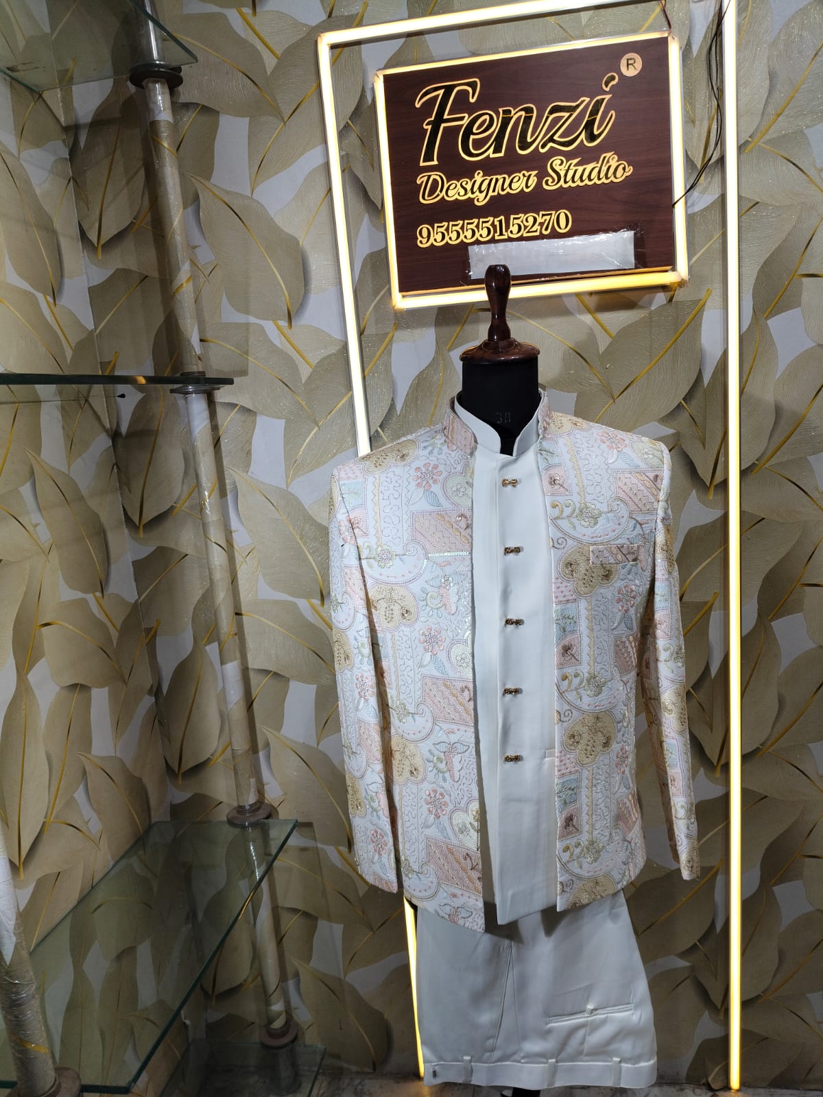 “White embroidered Jodhpuri suit with intricate pastel patterns displayed on a mannequin at Fenzi Designer Studio.”
