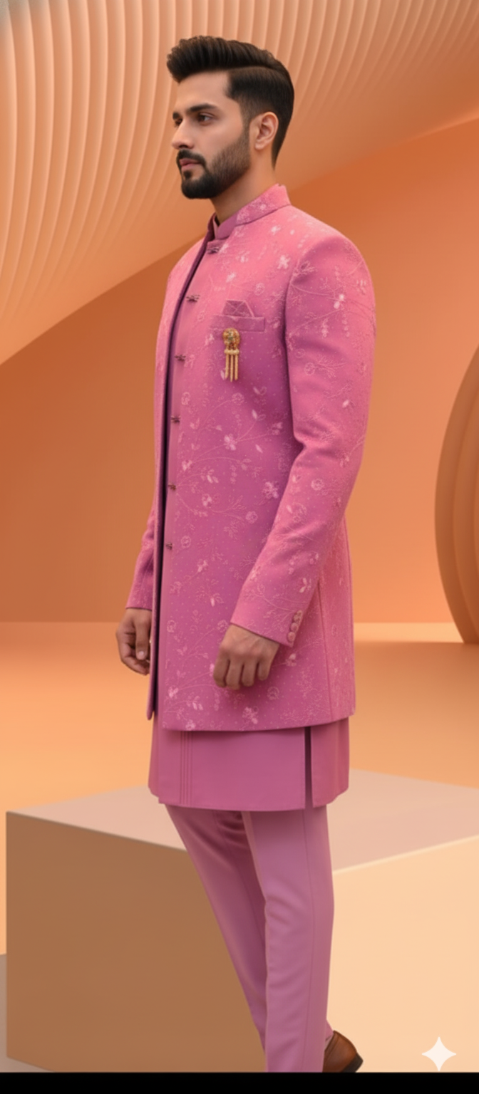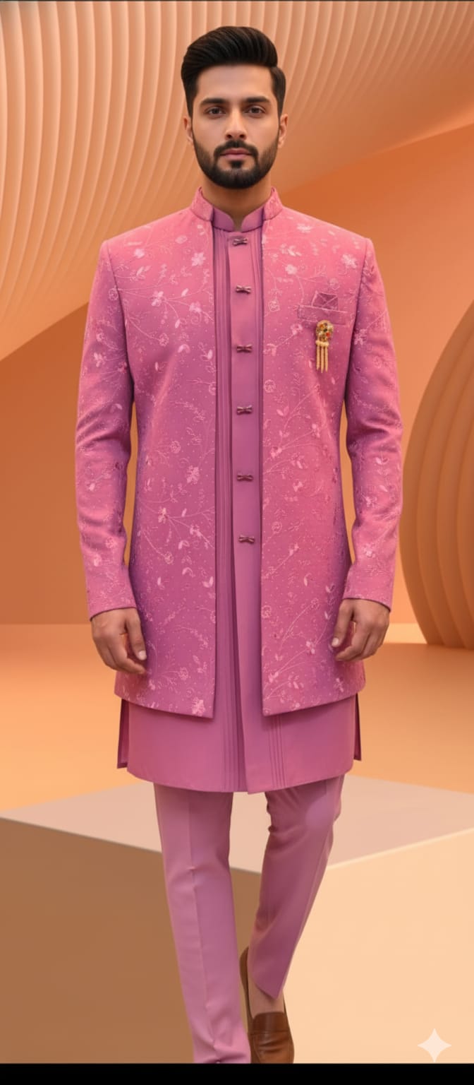 Step into the spotlight with our Regal Rose Embroidered Indo-Western Sherwani. This exquisite ensemble is crafted from luxurious art silk, offering a refined and comfortable fit. The sherwani jacket is adorned with detailed, self-colored thread embroidery in a delicate floral and geometric pattern, adding a touch of traditional artistry to its contemporary silhouette. The mandarin collar and front button placket provide a sharp, clean finish, while a matching inner kurta and trousers complete the cohesive three-piece look. The subtle dusty pink color palette is both unique and versatile, making it an ideal choice for a groom or a wedding guest looking to make a stylish statement. Pair it with a classic brooch or a pocket square to elevate your ceremonial style.Â